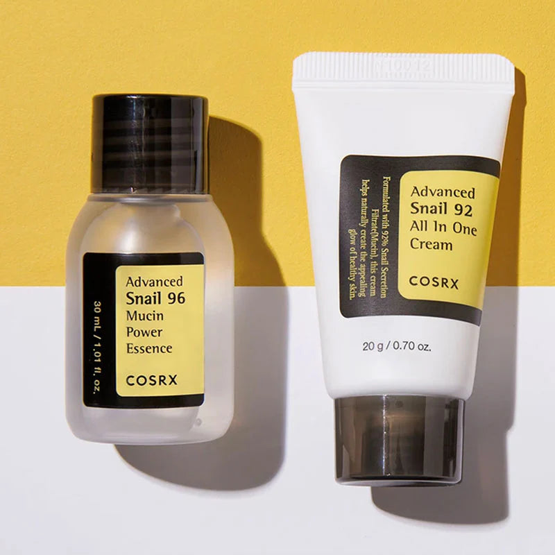 COSRX Advanced Snail Mucin Gel Cleanser, Water, Acrylates Copolymer, Butylene Glycol, Glycerin, Disodium Laureth Sulfosuccinate, Sodium Cocoyl Isethionate, 1,2-Hexanediol, Coco-Glucoside, Lauryl Betaine, Snail Secretion Filtrate, Arginine, Tromethamine, Potassium Cocoyl Glycinate, Fragrance, Carbomer, Sodium Chloride, Ethylhexylglycerin, Acrylates/C10-30 Alkyl Acrylate Crosspolymer, Sodium Polyacrylate, Disodium EDTA COSRX Advanced Snail 96 Mucin Power Essence, Snail Secretion Filtrate, Betaine, Butylene Glycol, 1,2-Hexanediol, Sodium Polyacrylate, Phenoxyethanol, Sodium Hyaluronate, Allantoin, Ethyl Hexanediol, Carbomer, Panthenol, Arginine