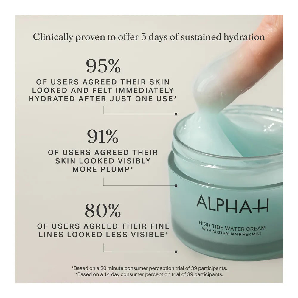 High Tide Water Cream: Aqua (Water), Glycerin, Squalane, 1,2-Hexanediol, Betaine, Hydroxyethyl Acrylate/Sodium Acryloyldimethyl Taurate Copolymer, Panthenol, C13-15 Alkane, Xylitylglucoside, Anhydroxylitol, Mentha Australis (River Mint) Leaf Extract, Urea, Trehalose, Xylitol, Allantoin, Sorbitan Isostearate, Citric Acid, Malachite Extract, Glucose, Sodium Phytate, Pentylene Glycol, Serine, Biosaccharide Gum-1, Erythritol, Disodium Phosphate, Pullulan, Sodium Hyaluronate, Caprylyl Glycol, Glyceryl Polyacrylate, Algin, Sodium Levulinate, Glyceryl Caprylate, Sodium Benzoate, Potassium Sorbate, Potassium Phosphate, Sodium Anisate, Hibiscus Sabdariffa (Red Sorrel) Fruit Extract