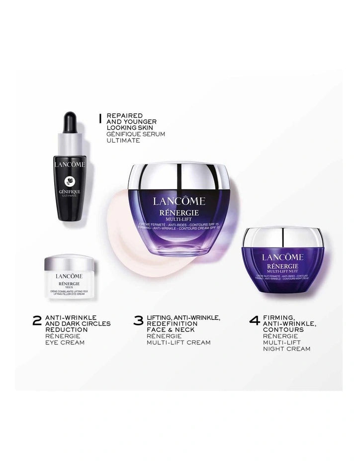 Step 4: Renergie Multi-Lift Night Cream 15ml Our iconic multi-lifting night cream formula for the face and neck, is now in a new redesigned glass jar. Combines Hyaluronic Acid, French Linseed Extract, and 6 different lipids to act at night, when skin renewal peaks.